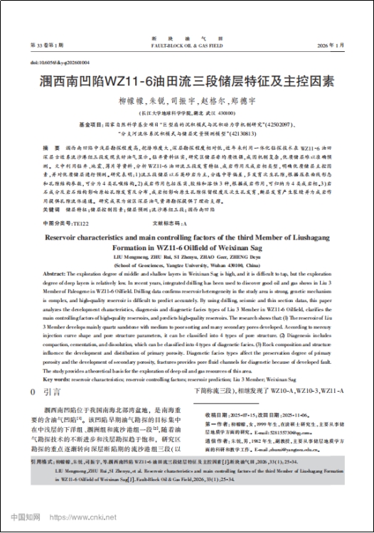 地科学院研究生柳幪幪以第一作者身份在北大核心期刊《断块油气田》上发表题为“涠西南凹陷WZ11-6油田流三段储层特征及主控因素”的研究论文,yl7703永利集团为论文第一署名单位。研究生柳幪幪为第一作者,副教授朱锐为论文通讯作者。