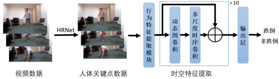 论文提出了一种基于视频人体姿态估计的跌倒检测新方法,通过改进时空图卷积网络(ST-GCN)实现高精度跌倒识别。研究设计了行为特征提取模块(BFE),通过融合当前帧静态骨骼坐标与相邻帧动态运动差异,显式建模时序运动特征;引入动态图卷积模块(D-GCN),利用可学习的动态系数矩阵自适应捕捉关节间动态关联;并提出多尺度时序卷积模块(MS-TCN),采用多膨胀系数并行时序卷积分支融合全局与局部时序特征。改进后的模型在URFD公开数据集上验证结果同基线ST-GCN方法相比,其准确率与F1分数分别提升6.89%与8.33%,达到99.45%与98.99%。且在跨场景验证中,模型在未见过的Multicam数据集上仍保持94.52%的准确率,展现出良好的泛化能力。此外,模型在GPU平台达到92FPS、CPU平台达到56FPS的实时处理速度。基于运动感知和时间增强的图卷积网络研究为跌倒检测问题提供了有效解决方案,有力支撑跌倒检测技术在智慧养老与居家监护场景的应用。