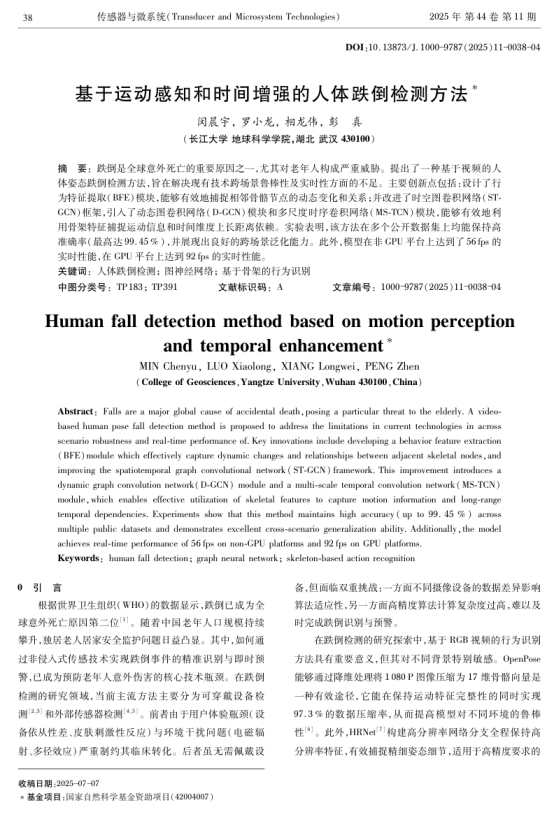 地科学院罗小龙副教授团队成员闵晨宇在相关期刊上发表题为"基于运动感知和时间增强的人体跌倒检测方法"的研究论文。yl7703永利集团为论文第一署名单位,硕士研究生闵晨宇为论文第一作者,其导师罗小龙副教授为该文通讯作者。