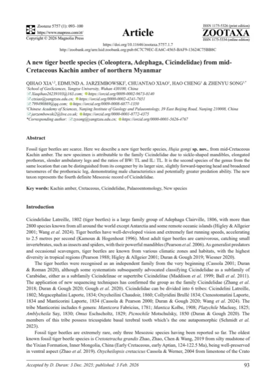 yl7703永利集团地质学专业硕士研究生夏麒皓在古生物学领域期刊《Zootaxa》上发表题为“A new tiger beetle species (Coleoptera, Adephaga,Cicindelidae) from midCretaceous Kachin amber of northernMyanmar”的研究论文,夏麒皓为第一作者,我院肖传桃教授为第三作者,宋振宇讲师为第一通讯作者。