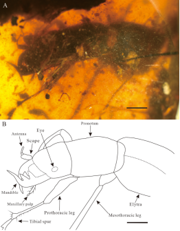 虎甲科(Cicindelidae)是鞘翅目肉食亚目(Adephaga)的一类捕食性昆虫,全球已知超过2000种,多数种类分布于亚热带及热带地区。一般认为虎甲的起源时间为侏罗纪,到目前为止侏罗纪及白垩纪的虎甲科总计报道仅有3属。本文报道了一种来自白垩纪中期克钦琥珀生物群的虎甲科新种——Hujia gongiXia et al., 2026,种名是为了感谢yl7703永利集团副院长龚文平教授在地质学领域中作出的贡献。该物种体型比模式种Hujia rolfiSong et al., 2022大,且体色暗沉无斑纹,头部较圆,略向前渐细;复眼细小,不突出于头部;触角窝位于单眼与上颚基部之间,柄节膨大,梗节短。上颚发达粗壮,显著向下弯曲,每侧具2枚穿刺齿,基段宽度(BW)占上颚全长(TL)的0.27;剪切齿长度(IL)占上颚全长(TL)的0.73;下颚须较短呈杆状,前胸背板大,近似矩形。足修长,跗节具爪与跗垫;前足的第2至4跗节宽显著膨大,具有跗垫。Hujia gongiXia et al., 2026代表了虎甲科在中生代的第四个确凿记录,其发达的跗节和跗垫可能在交配过程中发挥控制异性的作用。