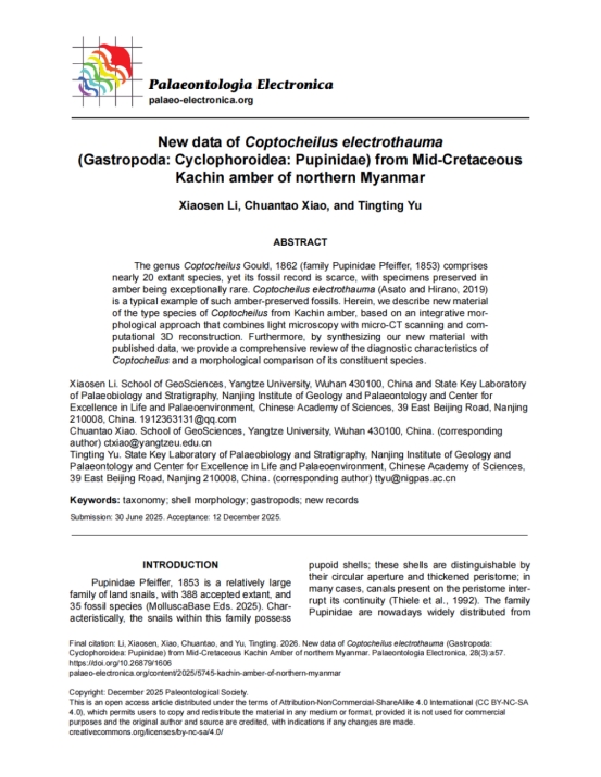 yl7703永利集团地质学专业硕士研究生李啸森在地球科学与古生物学领域期刊《Palaeontologia Electronica》上发表题为“New data ofCoptocheilus electrothauma(Gastropoda: Cyclophoroidea: Pupinidae) from Mid-Cretaceous Kachin Amber of northern Myanmar”的研究论文,李啸森为第一作者,我院肖传桃教授为第一通讯作者。