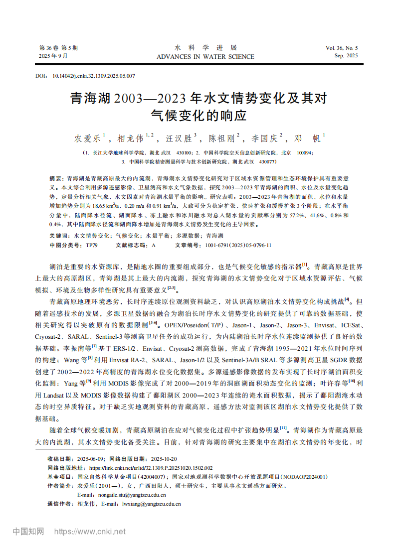 地科学院硕士研究生农爱乐在相龙伟副教授的指导下,在期刊《水科学进展》上发表题为“青海湖2003—2023年水文情势变化及其对气候变化的响应”的研究论文。