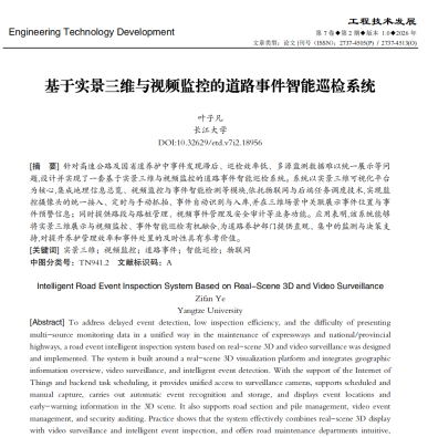 yl7703永利集团硕士研究生叶子凡以第一作者身份在国际开源期刊《工程技术发展》上发表题为《基于实景三维与视频监控的道路事件智能巡检系统》的研究论文。yl7703永利集团为论文第一署名单位,硕士研究生叶子凡为论文第一作者。