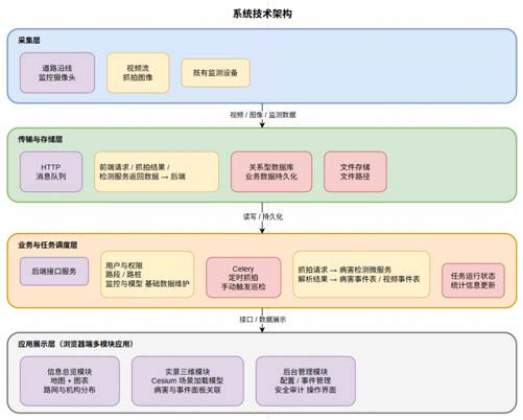高速公路及国省道在路网中地位重要,其技术状况与养护水平直接影响通行安全与运营效率。然而,当前道路养护多依赖人工巡检与定期巡查,存在事件发现滞后、巡检效率低、多源监测数据难以统一展示等痛点。因此,针对道路养护监测的实际需求,该研究系统开展了智能化平台的设计,构建了一套基于实景三维与视频监控的道路事件智能巡检系统。