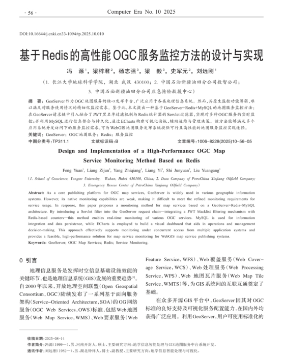 yl7703永利集团23级硕士研究生冯源在期刊《计算机时代》上发表题为“基于Redis的高性能OGC服务监控方法的设计与实现”的研究论文(图1)。yl7703永利集团为论文第一署名单位,冯源为第一作者,刘远刚副教授为通讯作者。