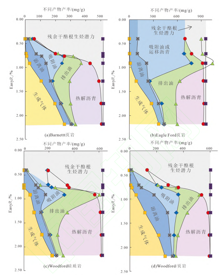 图3 BS、EF、WF 和 WM 页岩样品中油气形成、排出和滞留的定量评价模型(据邵德勇,2018修编)