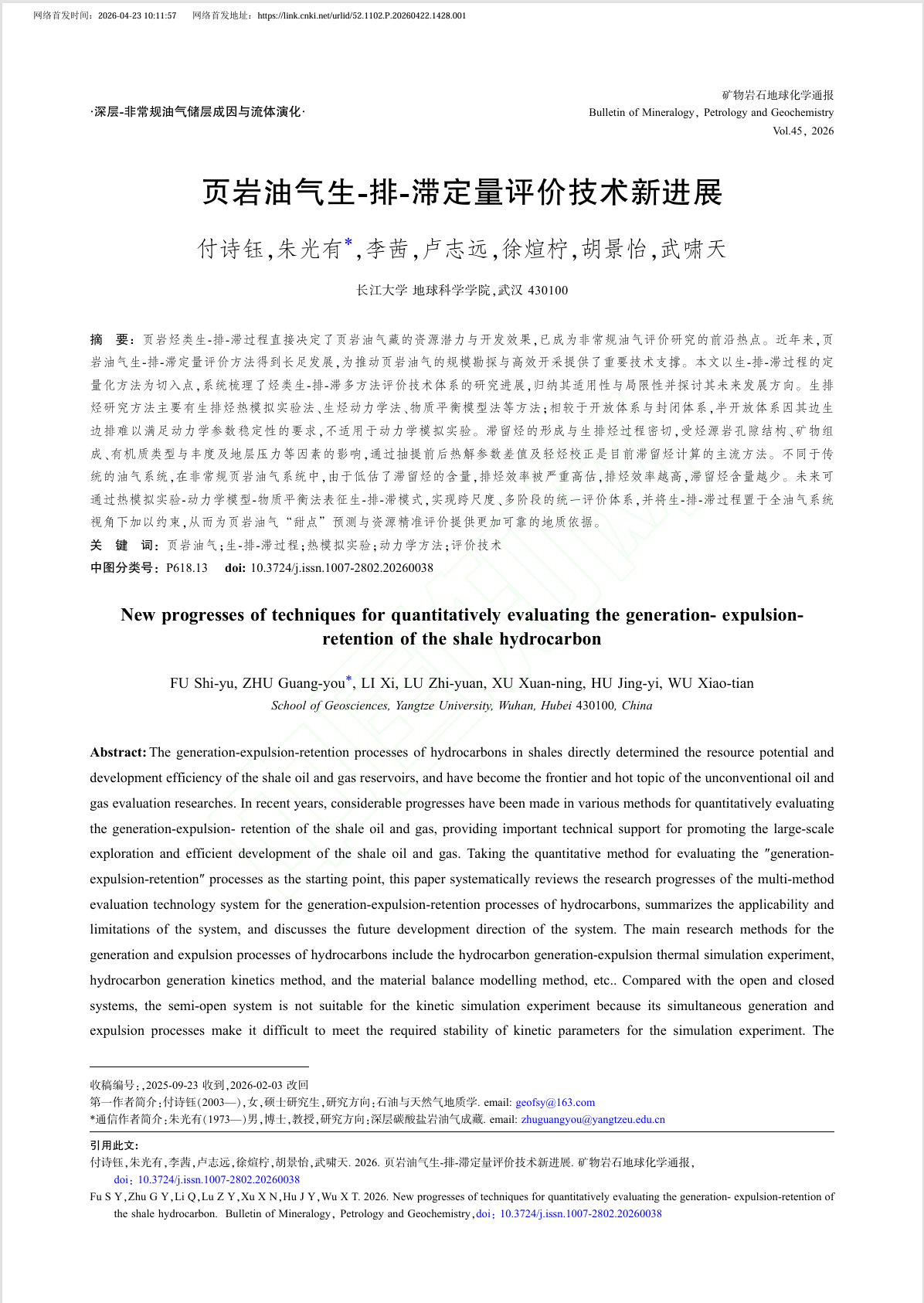 地科学院2025级地质工程专业硕士生付诗钰以第一作者身份在中文核心期刊《矿物岩石地球化学通报》上发表题为《页岩油气生-排-滞定量评价技术新进展》的论文。yl7703永利集团为论文第一署名单位,硕士生付诗钰为论文第一作者,导师朱光有教授担任论文通讯作者。