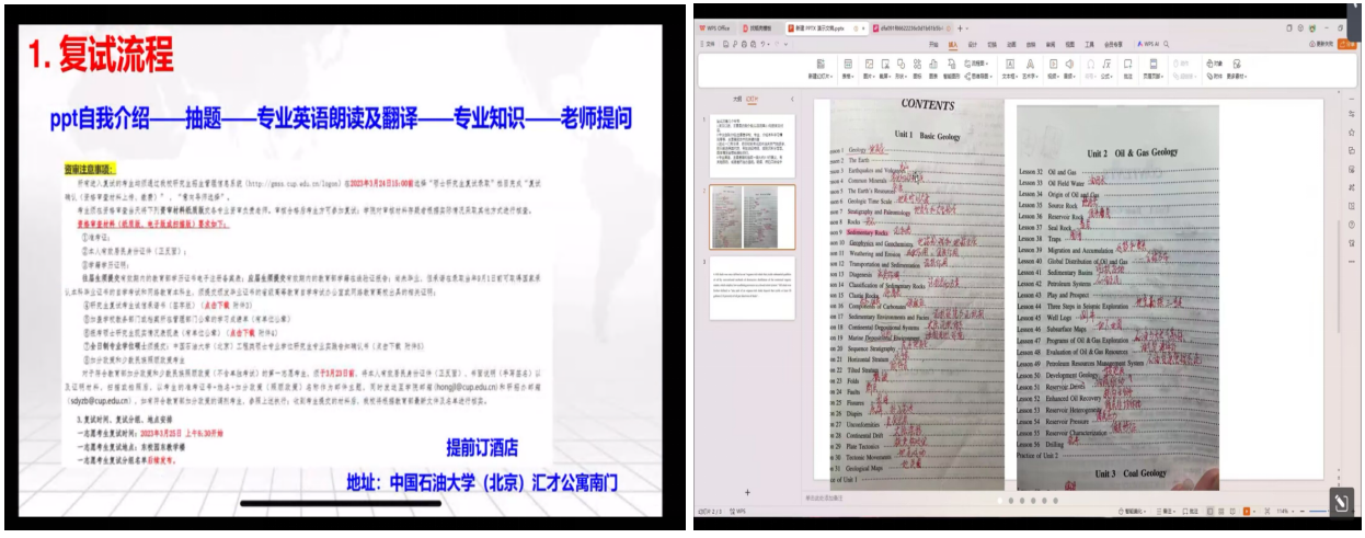 马福康同学介绍了中国石油大学(北京)的复试流程,针对PPT自我介绍环节,他建议从专业课成绩、科研经历、未来研究方向等方面进行展示,并回忆了十几道去年的复试真题,供大家参考。对于同学们头疼的专业英语问答环节,目前就读于中国地质大学(北京)的白棋源同学说,《专业英语》课程教材就是最好的复习资料,并建议大家将英语名词解释作为复习重点。对于英语自我介绍环节,他提醒同学们一定要提前准备确保流畅,以免紧张影响发挥。