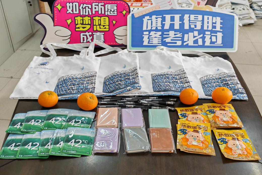 学院为每一位考研学子精心准备了“暖心大礼包”,内含文具套装、暖手帖、蒸汽眼罩、记事本等,寓意着“文”思泉涌、“暖”意融融、“眼”明心亮、“记”忆超群。这些承载着美好祝福的礼品都分装在学院学工办定制的文创帆布袋中,希望学院的祝愿陪伴着每一位学子在考场上披荆斩棘。