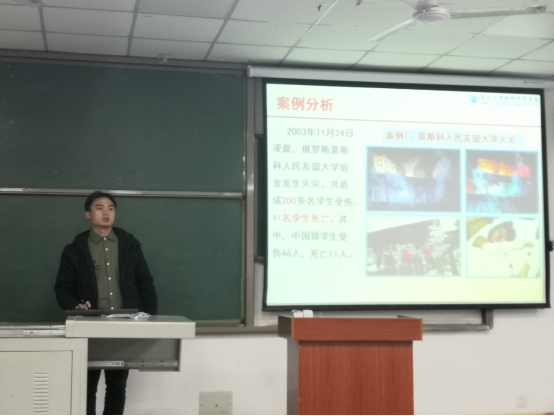 接着,为进一步提升学生安全防范意识,加强宿舍安全管理工作,张严老师面对全体班长进行了宿舍文明安全教育。首先,他对我院前期宿舍安全检查情况进行了通报与总结,叮嘱同学们要注意用电安全,排查可能存在的安全隐患,杜绝使用任何违规电器。紧接着,张老师为大家讲解了宿舍火灾发生的原因、火灾的预防以及自救措施,强调学生应主动排查安全隐患,防范于未然,做到“我懂安全,我要安全,事事安全,人人安全”。