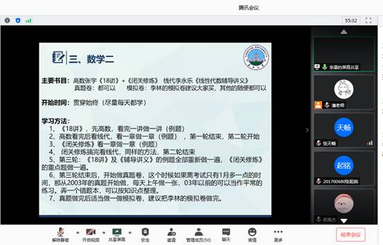6月14日晚7点半,资工(石油之光)21601班周郑鹏同学、资工21603班李康同学和资工21604班夏祥同学给2017级资工专业开展线上考研经验交流,他们分别以优异的成绩被同济大学、吉林大学和南京大学录取为硕士研究生。周郑鹏同学就各科考研复习进行了详细解读,他特别强调“英语复习不要局限于试题,应当注重口语和听力,进步可能比刷题来的快,甚至对考研复试帮助很大”。李康同学就考研导师选取和考研时间规划进行了重点解读,他说道:“学习要按部就班,不和别人比进度,弄懂最重要;要养成连续学习的习惯;要学会有效的自我调节;每天至少保持9个小时的学习时间”。夏祥同学就如何规划考研前期、考研中期和考研后期进行了介绍,他强调“要把知识学活,注重理解,考研其实并不难,天道酬勤,不要轻言放弃”。