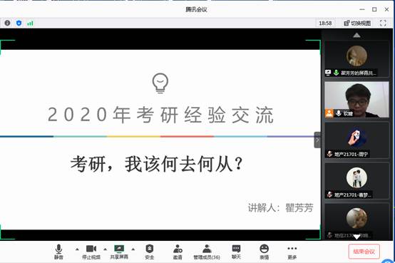 (通讯员 潘志远)为进一步提高我院2017级本科生考研热情,明确考研目标,掌握考研技巧,了解更多考研信息,我院于2020年6月11日-14日,分别邀请瞿芳芳、金澳涵、周郑鹏等8位2016级优秀考研学子,分地信专业、地质专业、资工专业3个专场,在腾讯会议上开展线上考研经验交流。
