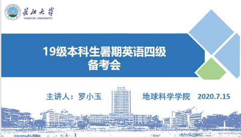 通讯员(蒋晓洁)为加强我院19级本科生对英语四级考试的重视程度、提升考试通过率,我院于7月15日晚八时通过雨课堂平台开展了线上英语四级暑假备考活动,本次活动由19级辅导员罗小玉老师主讲。