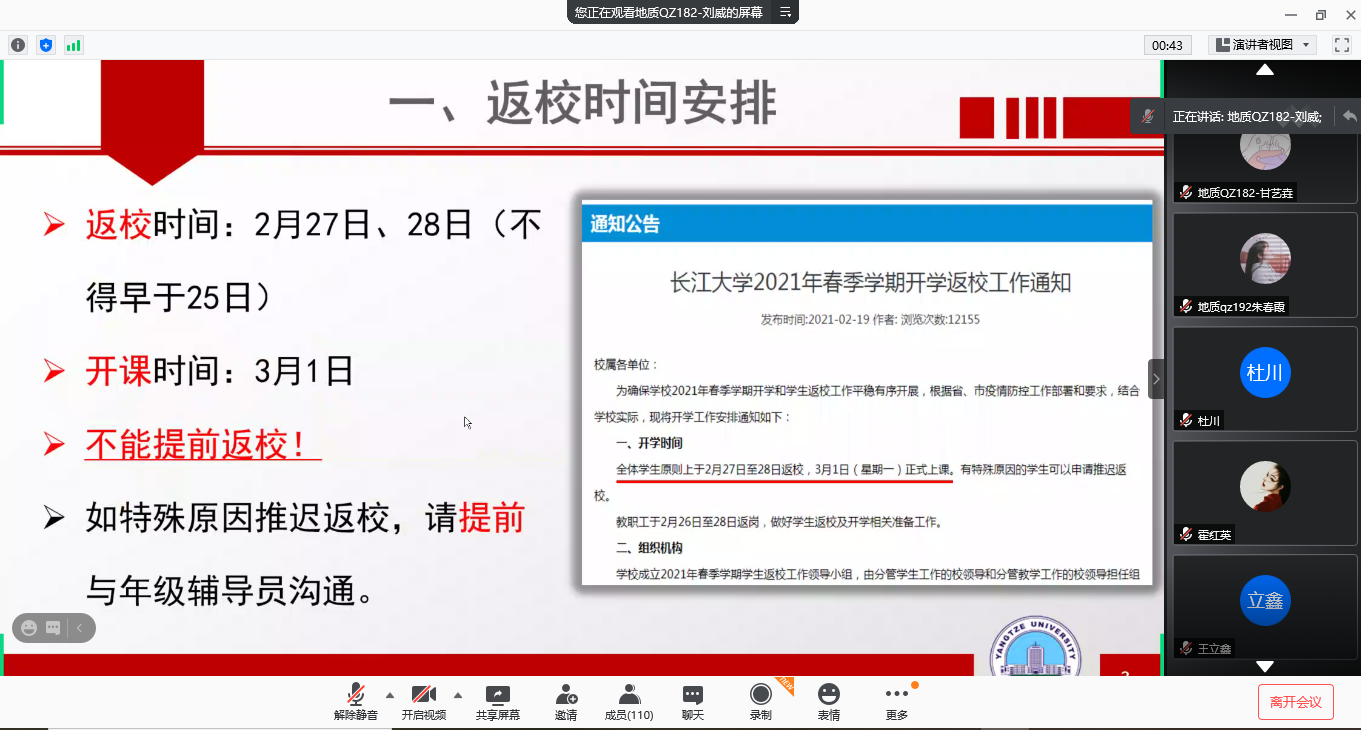 为了开好本次班会,我院学工办全体老师于2月22日晚集中开会讨论,并拟定《地科学院2021年春季开学工作实施方案》、主题班会PPT、延迟返校申请表等文件,力求将开学返校工作抓严、抓细、抓实。