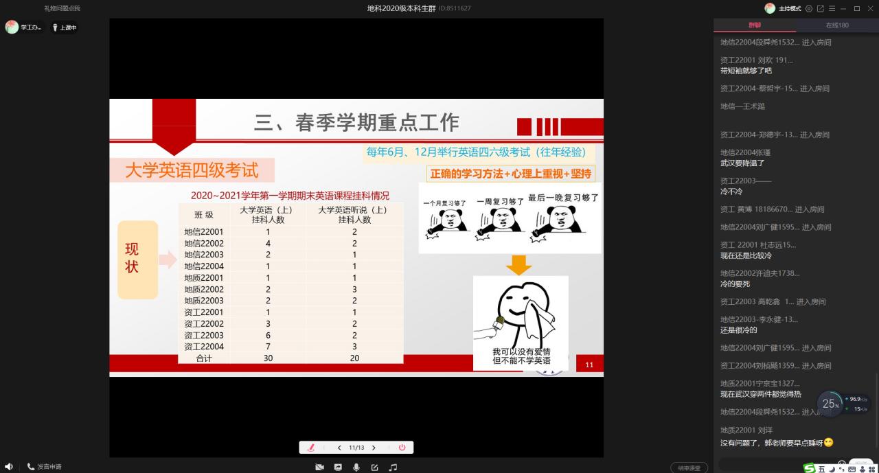 主题班会从返校时间安排、返校流程和2021年春季学期重点工作三个方面展开。首先,辅导员老师为同学们讲解了返校及开学的时间安排,并向大家强调不能擅自提前返校,对因特殊原因延迟返校的同学需要办理的手续进行了规定与解答。接下来,辅导员老师对返校的6步骤逐一进行了讲解,特别是对“申报”环节的“填写行程信息、提供通信大数据行程卡和健康绿码截图”与“核准”环节是否需要核酸检测结果等重难点进行了耐心的解释说明。随后,20级将英语四级考试、17和18级将就业及考研工作分别作为春季学期重点工作向同学们进行了强调与动员。最后,辅导员老师对大家的疑问一一进行了解答,并提醒同学们旅途做好防护。