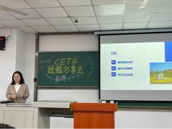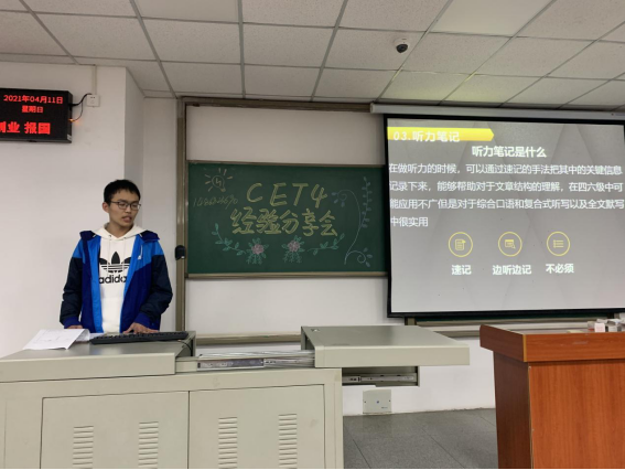 (通讯员王佳颖)为助力20级本科生顺利通过全国大学生英语四级考试,我院于4月11日晚19时分别在武教B-104和B-106教室举行了“2020级四级动员大会”。大会包括模考情况分析、提升计划安排和“学长学姐引领计划”之四级学习方法分享三个方面的内容,我院2020级全体同学和辅导员郭霖老师参会。
