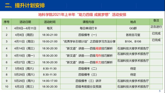 本次活动是我院2021年上半年“助力四级 成就梦想”系列活动的第二场,不仅增进了同学们对四级考试及自身英语水平的了解,更让同学们掌握了的不少学习英语的方法,激发了同学们英语学习的热情与主动性,促进我院学风建设良好发展。