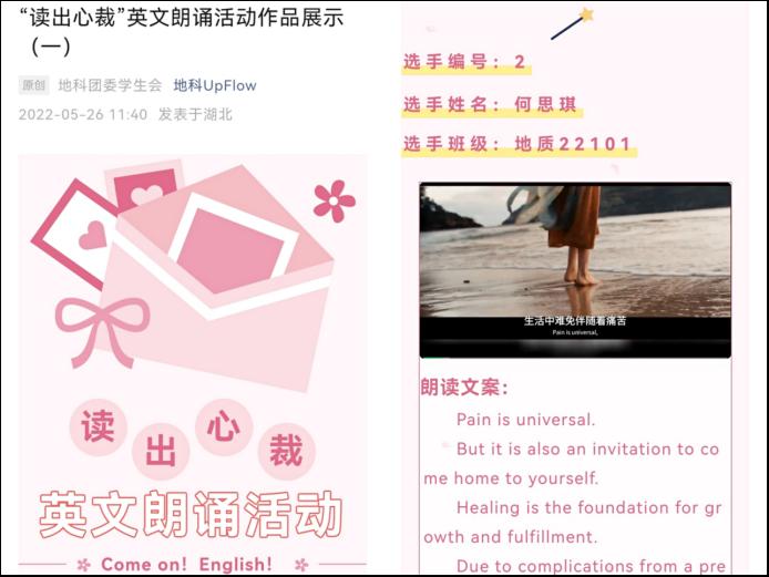 5月底至6月初,学生会学习部同学进班充分动员,吸引数百名同学参加。受疫情影响,本次活动采用线上的形式,参与者的朗诵内容发布在我院官微“地科UpFlow”公众号与yl7703永利集团官方QQ空间,邀请广大同学进行投票,同时邀请两名英语教师进行专业评分。