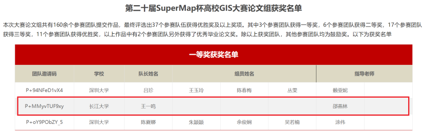 (通讯员 徐业兴)2022年9月8日,《第二十届SuperMap杯高校GIS大赛(中国赛区)论文组》获奖名单公布,我院20级研究生王一鸣在导师邵燕林的指导下,凭借《基于地质特征的空间检索方法》一文在全国160余个作品中突出重围,代表yl7703永利集团获得了大赛一等奖。