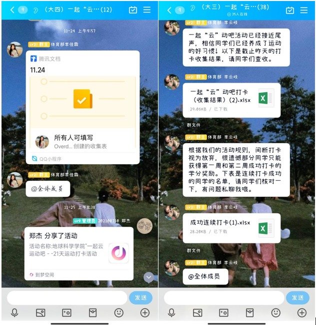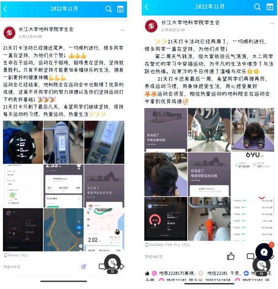 为扩大活动效果,展示同学们的运动风采,学院每三天在官Q空间发布活动进度,展示大家精彩运动瞬间和运动成果,并邀请了我院运动达人资工(卓越)21901班陈星兆和地质(工程)22001班张睿两位同学,分享自己的运动计划和感悟,引导大家科学运动,坚持锻炼。