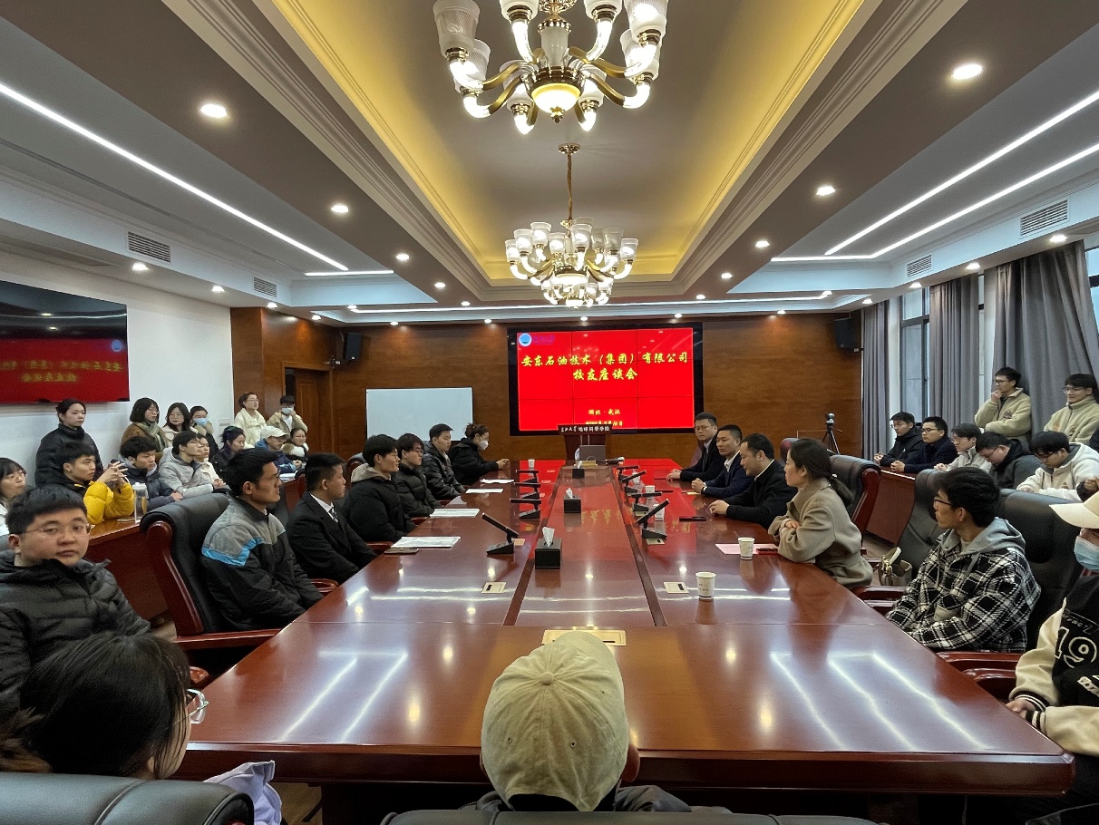 2月16日下午4时30分,安东石油技术(集团)有限公司校友在石油科技大楼C201会议室与部分2023届毕业生进行座谈。