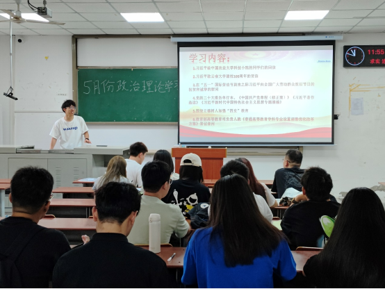 (通讯员王少宁)为督促我院研究生深入学习贯彻习近平新时代中国特色社会主义思想,深入学习“四史”教育的价值导向,提升我院研究生政治理论素养,在思想上、政治上、行动上时刻同党中央保持高度一致。于5月31日正午,我院研究生在武教A108教室集中进行了线下政治理论学习活动,此次政治理学习活动由研究生会主席刘作松主持与讲解,部分研究生参加。