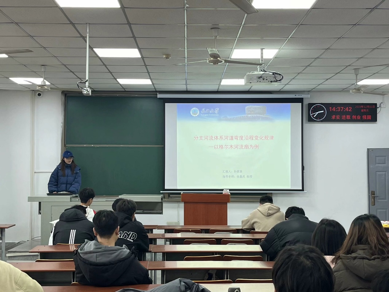 随后,孙家惠跟我们分享了有关格尔木河柳扇的研究成果。她利用这个具体的案例向大家介绍了分支河流体系中河道弯曲沿程的变化规律。她认为这样的研究对于理解河流体系的演化过程、河道形态的形成与变化等方面具有重要意义。关于论文撰写,她提到要注重论文配图的精美程度,语言表达要简洁明了,客观地陈述自己的研究内容。
