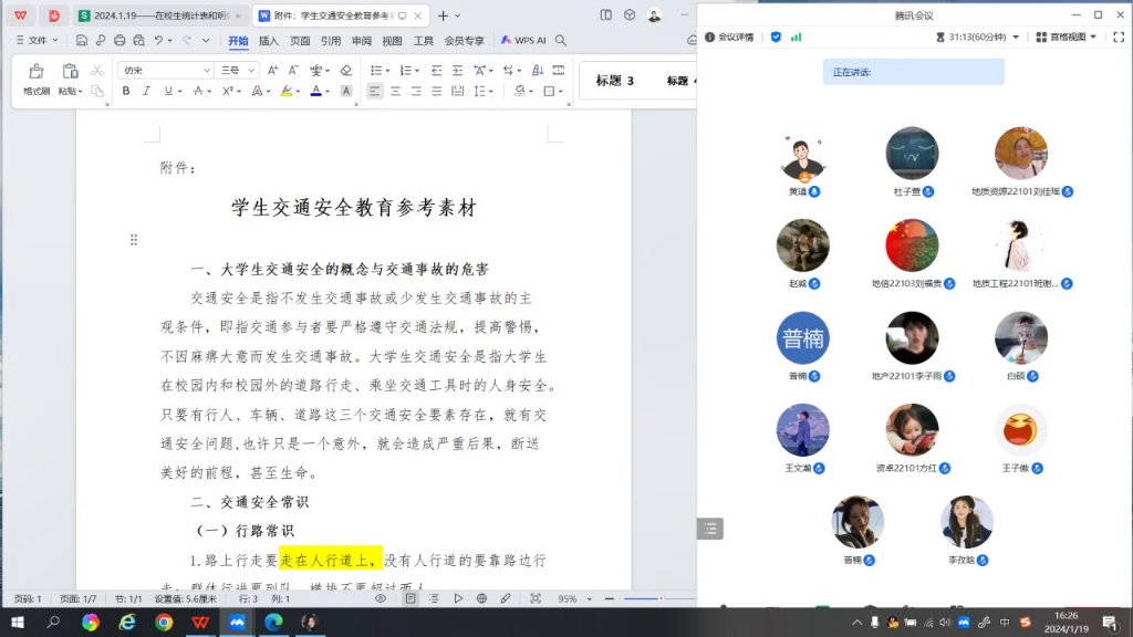 我院由学工办老师带队,通过线上线下相结合的方式开展交通安全教育专题班会。通过普及交通安全法规、分享交通事故典型案例,引导同学们互动讨论,强化对步行、骑车、乘车、水上交通等出行方式的安全宣传教育,引导同学们牢固树立“安全重于泰山”的责任意识,克服麻痹思想和侥幸心理,自觉遵守交通法规,维护校内外交通秩序。