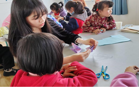 手工制作组的志愿者们也带着折纸材料开始了有趣的课堂教学。折纸,就像是美轮美奂的魔术,一张张彩纸在小朋友的手中通过巧妙地翻折、粘贴、描绘等,变幻成一件件富有创意的作品。