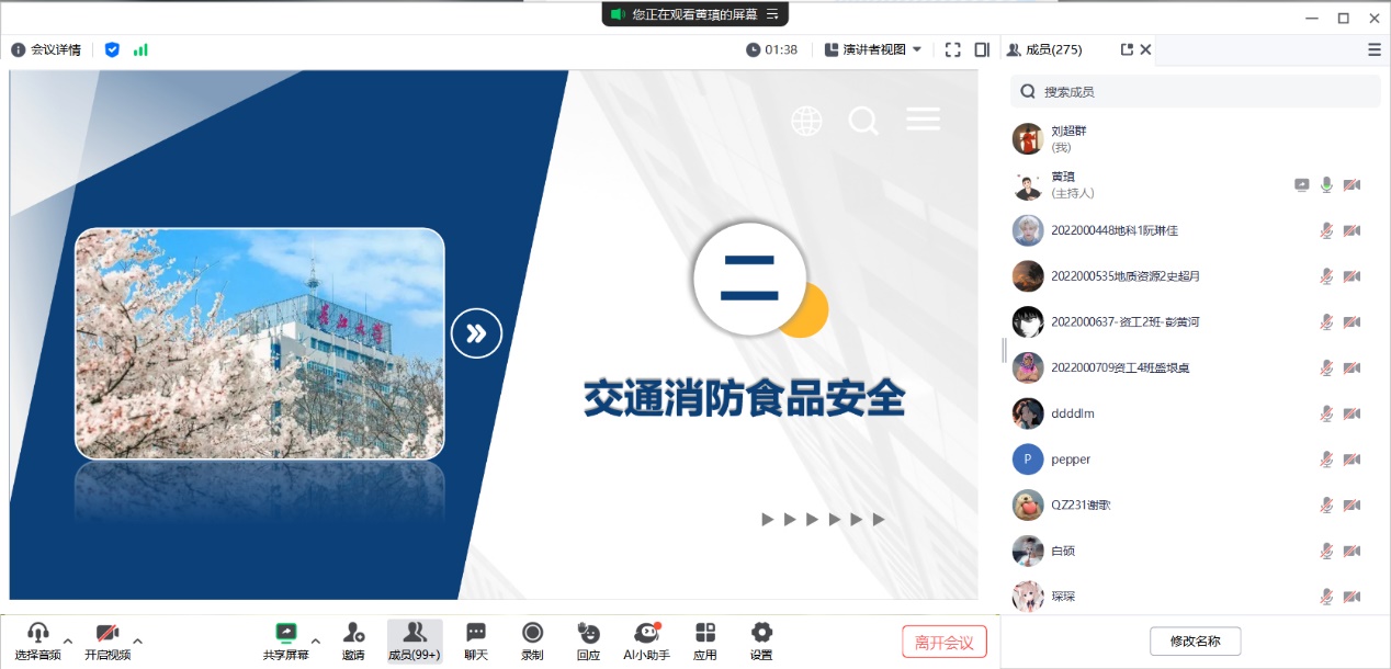 此次班会以班级为单位,由班主任、班长组织落实,采取线上线下相结合的方式进行。会上首先介绍了学校的放假安排,强调学生不论外出还是留校都需要登记出行信息,保持通讯畅通,秉持“生命至上、安全第一”的原则,其中离校需要办理请假手续,报备假期行程。接着重点对反电诈、“抵制网络不良言论”、“交通消防食品安全”、“防溺水、防诈骗、防欺凌”、“禁止毒品”等方面的安全常识进行说明。