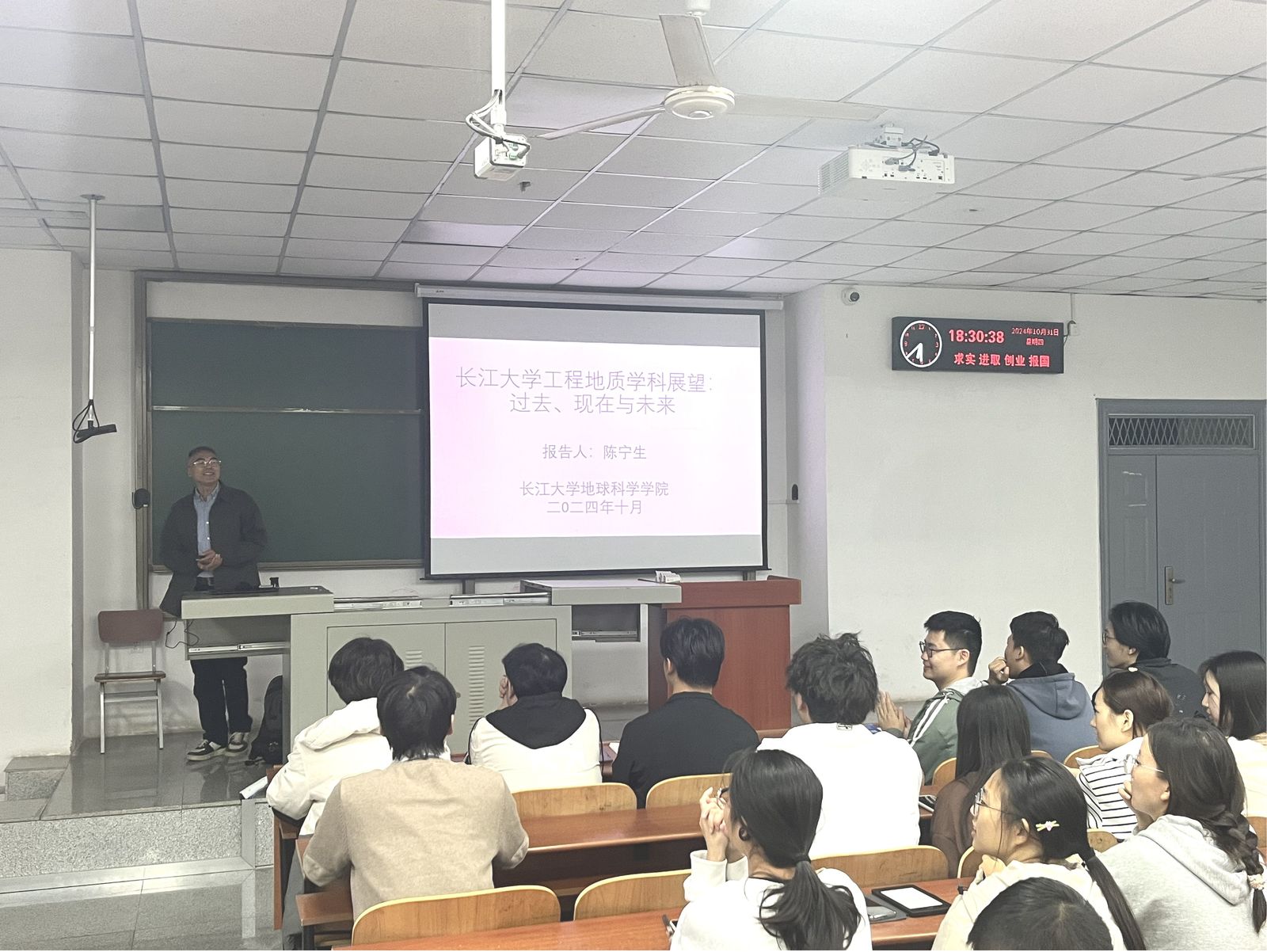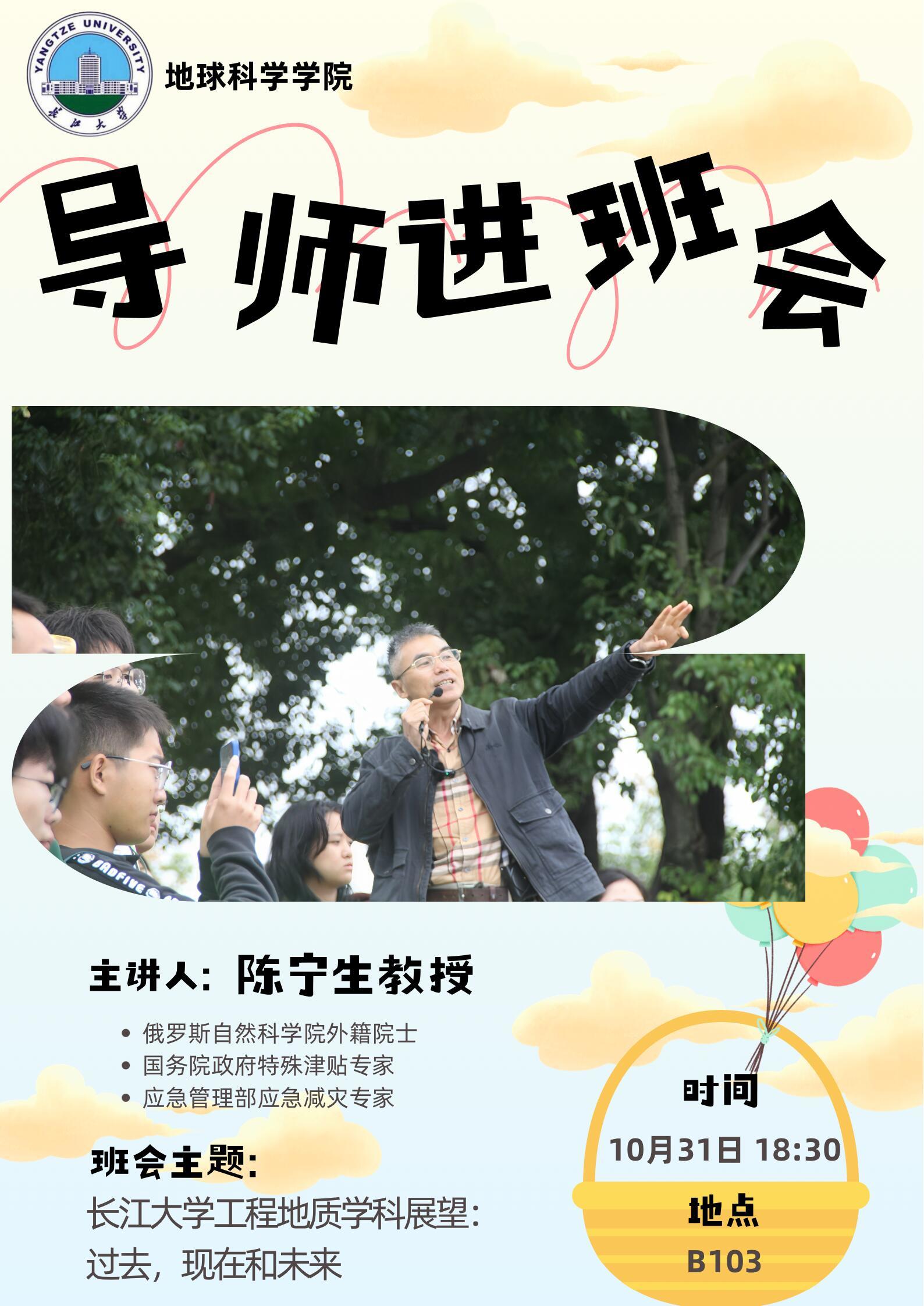 (通讯员 郭霖 党宇烁 李永健)为提高学生专业学习兴趣,帮助学生了解学科动态,助推我院学风建设,10月31日晚我院陈宁生教授做客“导师进班会”系列活动,在武教B103教室开展了题为“yl7703永利集团工程地质学科展望——过去、现在和未来”的主题班会。陈教授团队教师、22和23级地质系全体本科生参会,现场掌声雷动,气氛热烈。