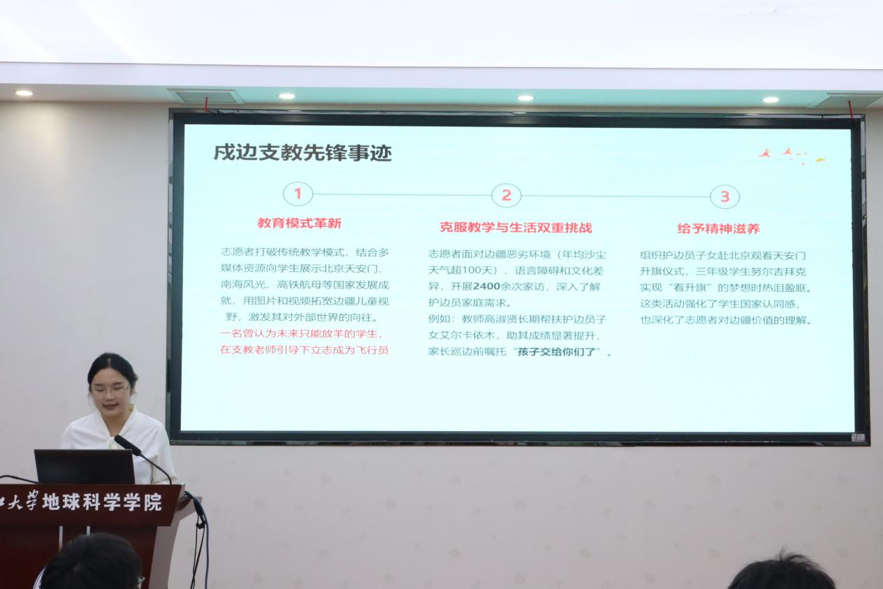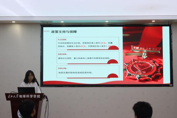 在主题分享环节,来自新疆的马英俊杰同学结合家乡的发展现状,阐述了边疆建设的时代意义。他表示,作为地信学子,他将努力学习专业知识,毕业后回到家乡,为家乡的发展贡献青春力量。随后,薛心怡同学系统解读了西部计划政策,围绕“政策支持与保障、服务地选择与岗位、整体报考流程、备考策略”四个方面展开。她认为西部计划不仅是志愿服务,更是青年将个人理想融入国家战略的关键通道。
