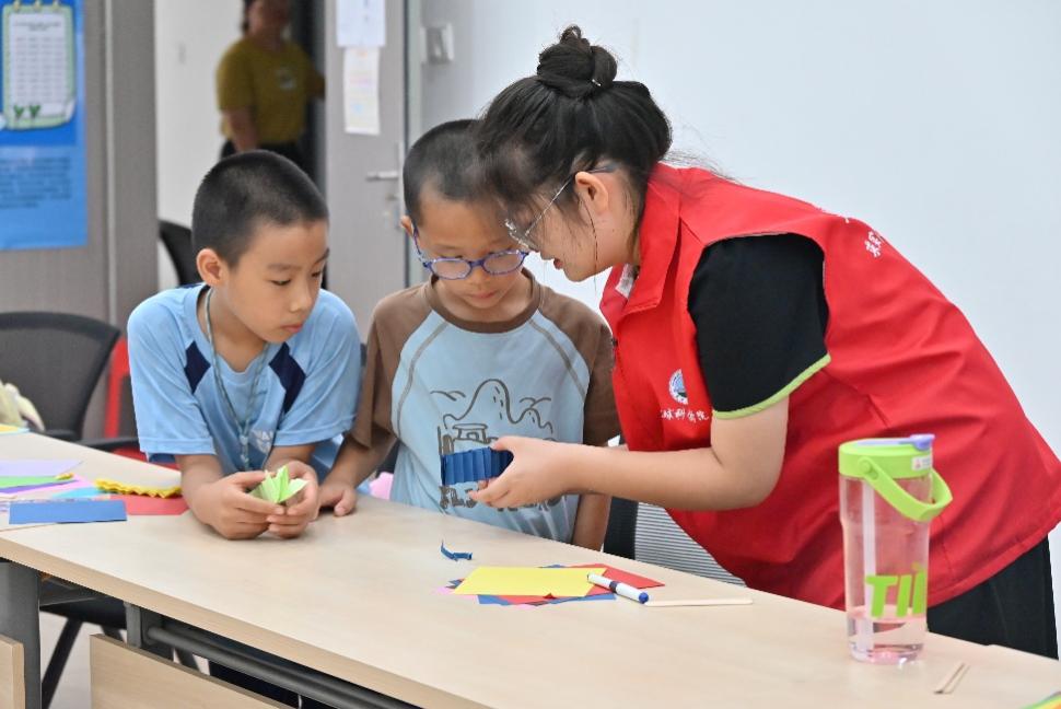 “这里要对齐边角,折的时候用力均匀一点……”志愿者们穿梭在孩子间,针对大家遇到的难点逐一解答。小朋友们专注地跟着步骤操作,时不时举着半成品向老师请教。