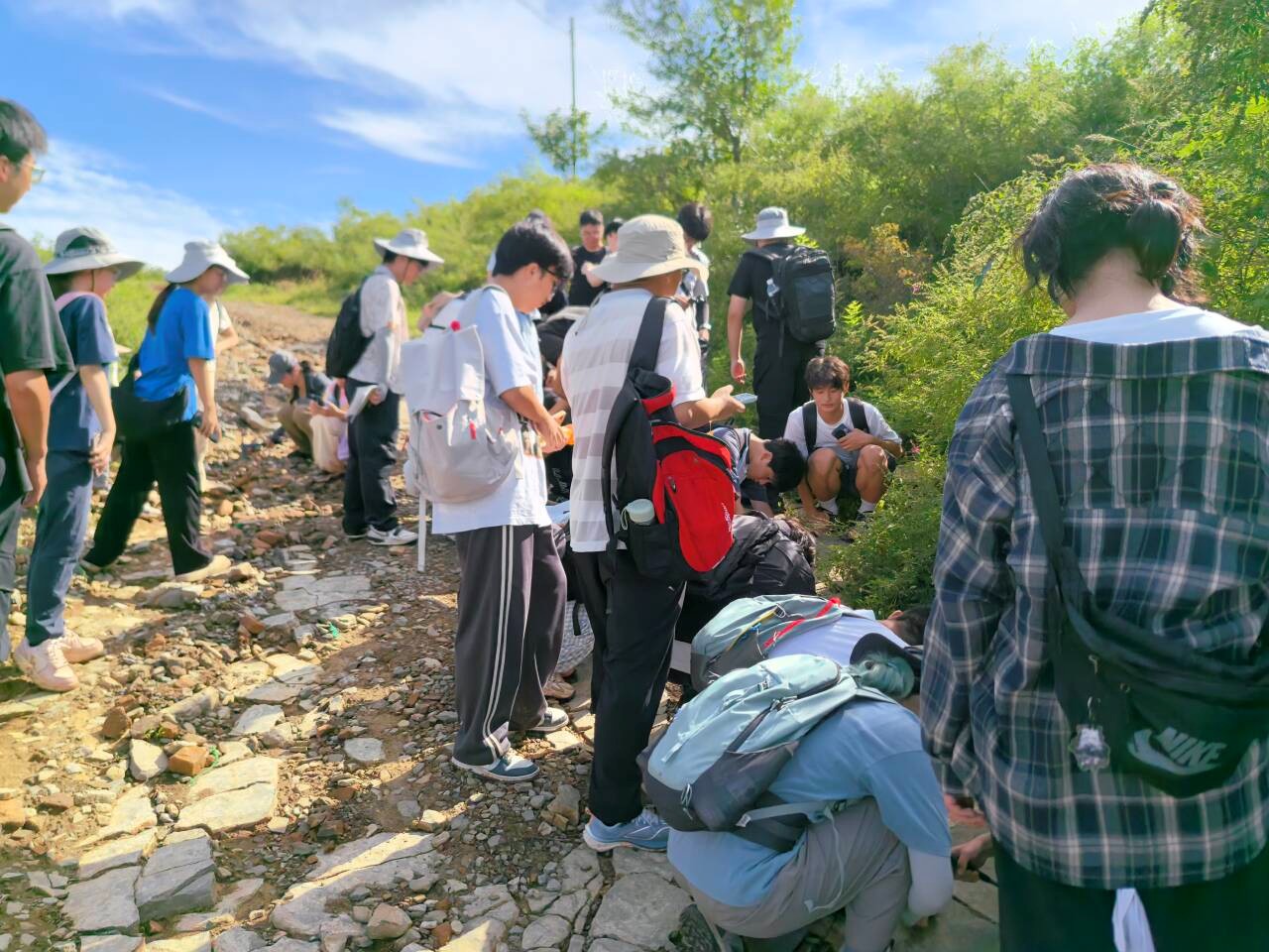 在亮甲山,老师捡起一块岩石问道:“如何判断碳酸盐岩中白云岩和灰岩的相对含量?”老师们通过言传身教,为学生精准答疑解惑。东部落的府君山组豹皮状灰岩、景儿峪组紫色泥页岩、王铁庄的张夏组鲕粒灰岩、潮水裕的崮山组竹叶状灰岩、亮甲山的亮甲山组虫迹灰岩……同学们通过滴稀盐酸、观察颗粒结构、辨别矿物成分,逐渐学会了区分三大类岩石,尤其是对沉积岩的精准定名,更充分感受到内外力作用在碰撞和消长中共塑大地的脉搏。