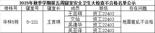 为加强学生宿舍安全管理和文明建设工作,确保学生宿舍安全、整洁、文明、有序,根据学校要求,我院于10月9日开展了第5周学生宿舍自查工作,现将检查情况通报如下