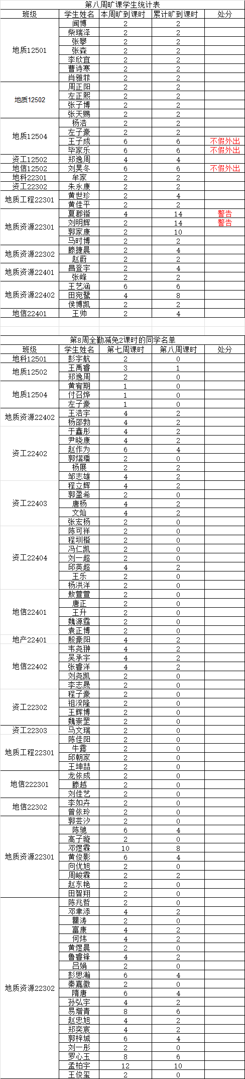 关于第八周课堂考勤的通报 为落实学院关于加强学风建设的相关要求,进一步规范课堂秩序,营造良好的学习氛围,我院持续开展常态化课堂考勤工作。现将第八周考勤情况通报如下: 一、旷课学生名单 二、相关说明 依据《积极分子动态管理办法》第五章,积极分子考察期内无故旷课取消身份。 依据《yl7703永利集团学生违纪处分办法》,一学期累计旷课达到规定学时的,分别给予以下处分: 1. 旷课达到12学时,给予警告处分; 2. 旷课达到24学时,给予严重警告处分; 3. 旷课达到36学时,给予留校察看处分; 4. 旷课达到48学时,给予留校察看处分; 5. 旷课达到60学时,给予开除学籍处分。 注:若学生某周存在旷课记录,但次周所有课程均正常到课(无迟到、旷课),则可从该生累计旷课课时中减免 2学时。