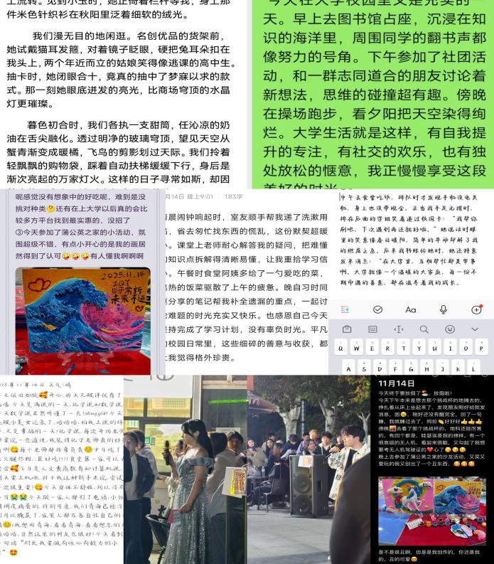(通讯员 吴越)为引导同学们感知生活美好、培育感恩心态,我院学生会心育部于11月8日起开展“感恩日记——寻找身边的小确幸”主题活动。这是我院连续第5年举办此次活动,在为期21天的活动中,同学们踊跃参与,以文字为媒记录生活点滴,在分享与交流中传递温暖力量。 活动期间,同学们积极响应号召,通过线上平台提交日记。字里行间既有清晨食堂温热的早餐、室友顺手递来需要物品的默契、也有秋日闪光的银杏树、第一次去图书馆的奇遇等日常小确幸,还有学业瓶颈时的困惑、人际相处中的烦恼等真实情绪表达。“晦涩的函数,经老师结合案例拆解,遗留的疑问一一解开,下课铃响,这份扎实的收获让整个上午充满干劲。”“感恩室友察觉到我的疲惫,一杯热奶茶,甜暖顺着喉咙淌在心里。”“和社团志同道合的朋友讨论新想法,思维的碰撞超有趣”细密的话语充满大家对生活的认真与热爱。 每日心育部工作人员会精心筛选优秀日记并线上展示,既为同学们提供了情绪释放的窗口,也让积极向上的生活态度感染更多人,形成了“记录——分享——共鸣”的良好氛围。 此次感恩日记活动以贴近生活的形式,搭建了学子情感表达的平台,不仅帮助大家在忙碌的学习生活中慢下脚步,发现平凡日子里的美好,更强化了感恩意识与心理韧性。尽管活动已经结束,但相信并祝福每一位地科学子常怀感恩之心,善于发现美好,在逐梦路上温暖前行! (编辑 王红桥 审核 冯舒)