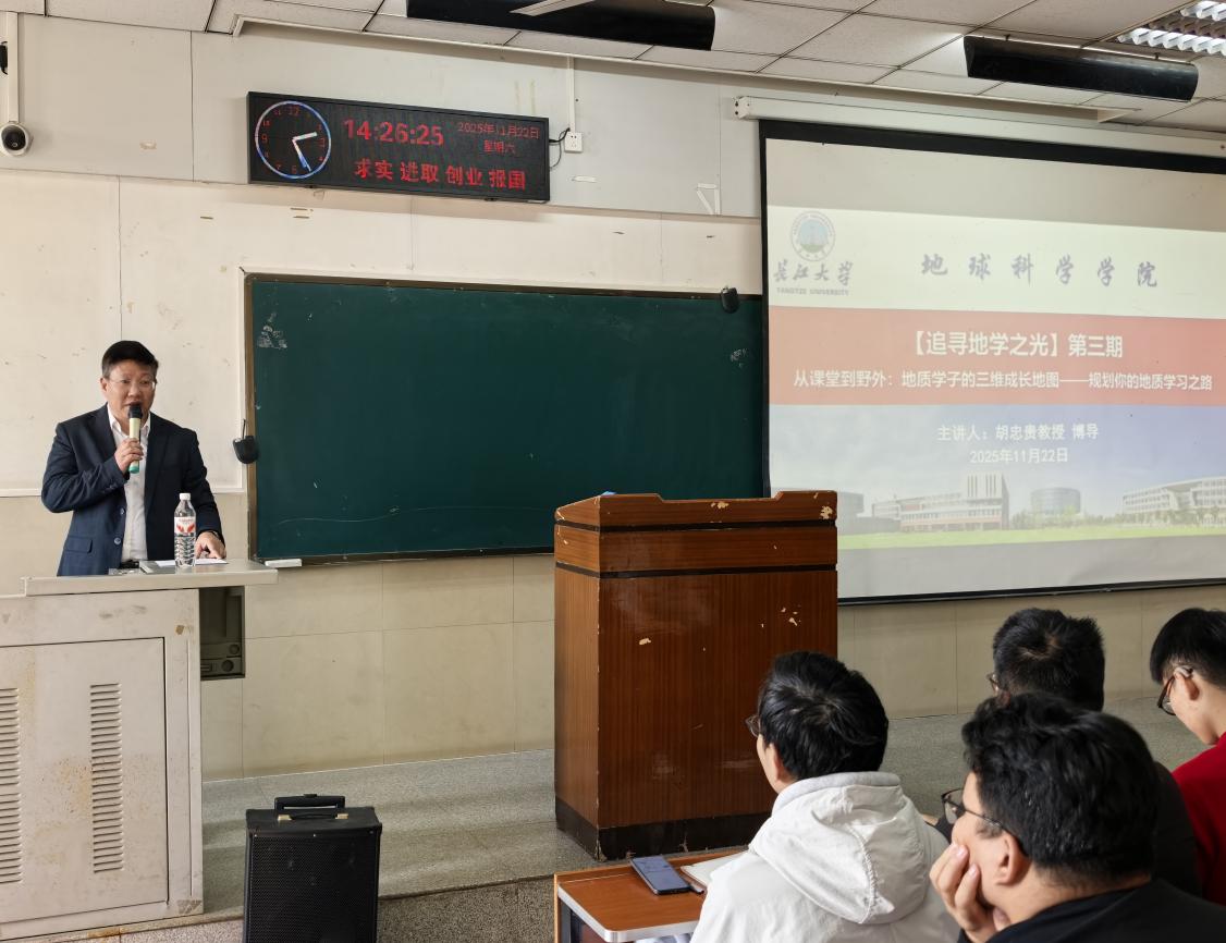 (通讯员 黄瑱/文 徐泽文/摄)11月22日下午,在东校区12教204室,yl7703永利集团副院长胡忠贵老师做客第三期“追寻地学之光”,开展了题为《从课堂到野外:地质学子的三维成长地图——规划你的地质学习之路》的讲座。全体2025级地质系、地科系同学参加,活动由年级辅导员黄瑱主持。