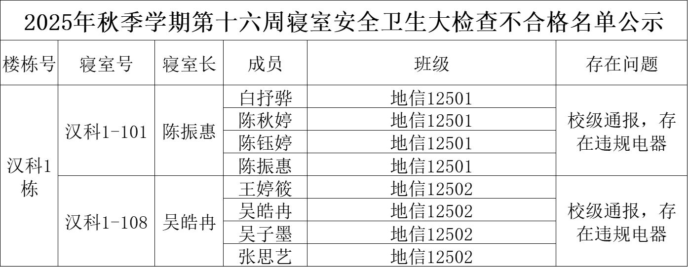 为加强学生宿舍安全管理和文明建设工作,确保学生宿舍安全、整洁、文明、有序,根据学校要求,我院于12月25日开展了第16周学生宿舍自查工作,现将检查情况通报如下