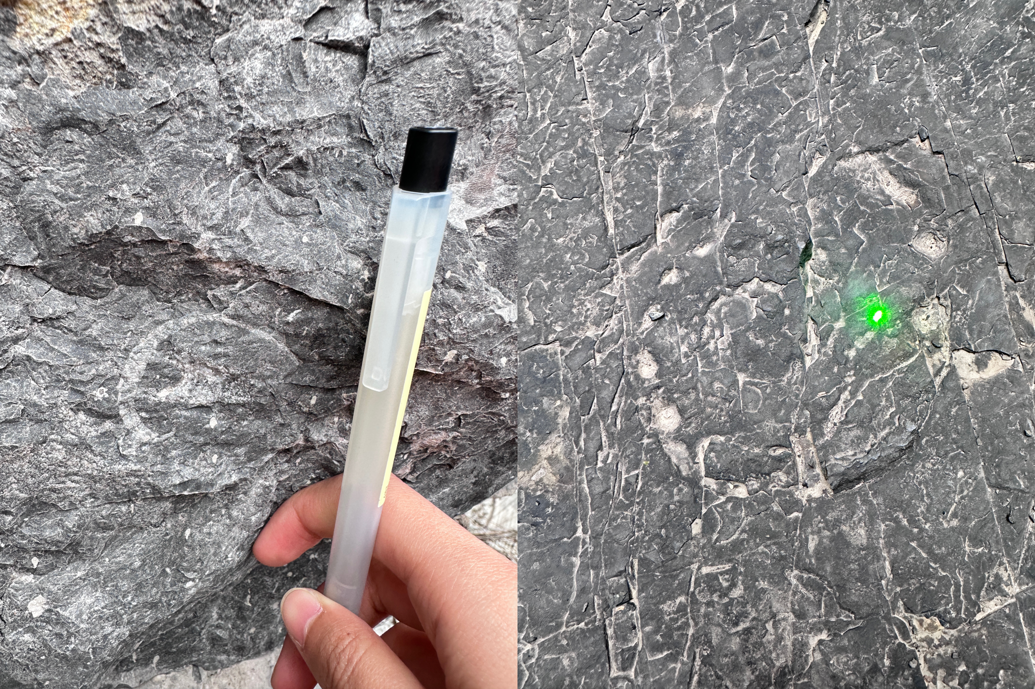 午后在庙坡组黑色页岩区遭遇认知困境。老师指着岩壁:"笔石就在这儿。"众人俯身细察十分钟,岩面仍是一片混沌墨色。直到郭辉辉同学的锤尖挑起半片羽毛状印痕——那些碳质薄膜竟比发丝更纤细。"深海停尸房啊,"有人喃喃道,"笔石随洋流沉入缺氧海底,一躺五亿年。"