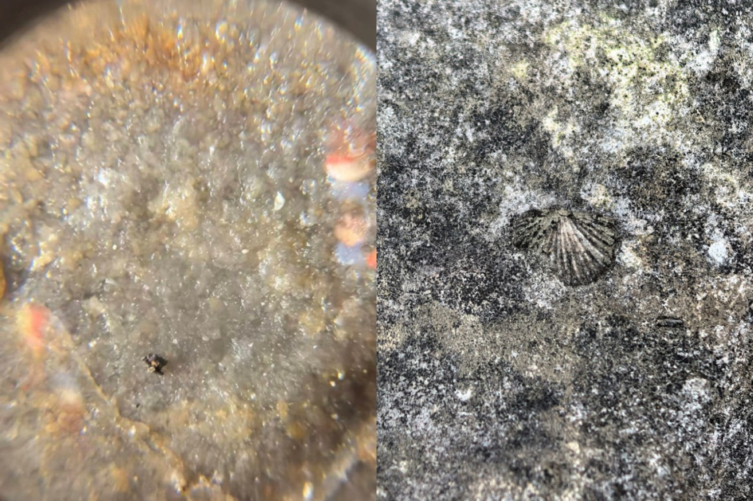 转向大湾组紫红页岩时,一片青铜光泽拽住视线。"扬子贝!"同组的苏佳芮同学轻呼出声。扇形纹路的化石嵌在岩层中,老师用地质锤柄轻点岩面:"这是奥陶纪的'标准签名'。"锤尖悬停处,岩屑簌簌掉落,惊起石缝里的草蜢。